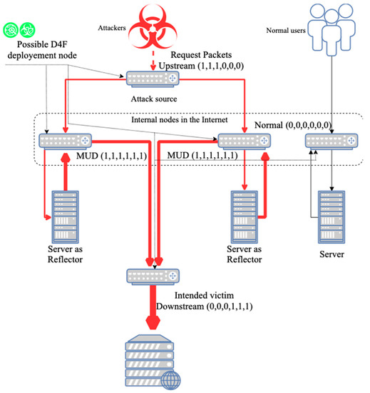 - Internal Nodes in the Internet. The nodes in the internet can obtain both upstream from attack flow and send downstream attack flow, which means that both streams can be observed and extracted. We are calling the flow with these features mentioned as mixed upstream and downstream (MUD). When attack flow lies in the MUD, we can still recognize the threats by classifying this with normal flow with random forest, and initiate differentiated service to drop the attack packets, so that the attack flow could be reduced, and the network load could be relieved.