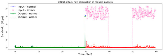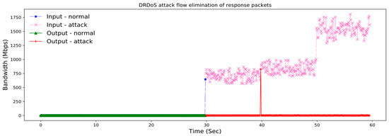 We could see that after applied the defense method we proposed, the DRDoS attack flow showed a gigantic drop, which suggests that the method is valid and could effectively relieve the network load for the intended victim, avoiding service degradation or denial of service for normal users as much as possible. And we illustrated the for and in Figure 10.
