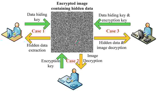 In 2008, Puech et al. [] proposed the concept of data hiding for encrypted images (DH-EI). Later, many schemes [,,,] were developed to improve the performance of DH-EI. According to the smoothness of image blocks, Zhang’s scheme [] embedded additional data by flipping the three least significant bits (LSBs) of the specific pixels in each block, but the additional data cannot be extracted before image decryption. Li et al.’s scheme [] introduced random diffusion and an accurate prediction strategy to efficiently use the correlation of pixels in order to obtain greater hiding capacity. By compressing the encrypted LSBs, Zhang’s scheme [] made space for data hiding in order to separate the extraction of data from image decryption. This separable data-hiding scheme provides more flexibility in protecting the privacy of users’ data. The receiver can extract the hidden data or decrypt/reconstruct the protected private image, respectively, according to the key he/she permits. Figure 1 shows the three different cases for the receiver, i.e., (1) If a receiver has only the data-hiding key, he/she can extract the hidden data without seeing the content of the image; (2) If a receiver has only the encryption key, he/she can decrypt or reconstruct the protected private image, which is similar to the original image, but cannot extract the hidden data; (3) If the receiver has both the encryption key and the data-hiding key, he/she can extract the hidden data and reconstruct the protected private image.