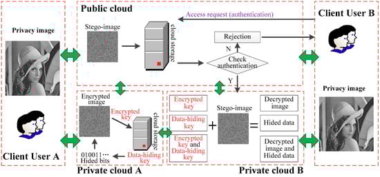 In cloud computing, a user usually hopes to encrypt the image before transmission to protect the privacy of the image. Figure 2 shows that user A encrypted the private image, saved the encrypted key into his/her private cloud storage, and then embedded the hidden bits into the encrypted image by using the data-hiding key. So, the stego-image, i.e., the encrypted image that contained the hidden data, was saved in the public cloud. When user B wants to download user A’s image, he/she must provide authentication information to the public cloud. User B must pass the authentication before he/she can download the stego-image and obtain the corresponding information according to the key that he/she has.
