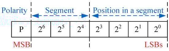 Step 2. Position in the segment. The LSBs indicate the quantized value of the sampling level inside one of the segments. Thus, each segment is divided into a linear fashion into 16 quantum levels. The numbers from 0 to 15 are used to denote the position p2 in a segment. So, the position p2 of the sampling level in a segment can be computed using Equation (8):