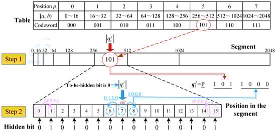 Then, two steps, i.e., the segment and the position in the segment shown in Figure 4, must be finished to obtain an 8-bit codeword that has a hidden bit. Figure 5 shows the encoding and hiding processes.