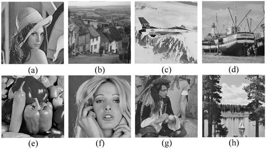 Eight original protected images in this experiment: (a) Lena, (b) Goldhill, (c) Airplane, (d) Boat, (e) Peppers, (f) Tiffany, (g) Man, and (h) Sailboat.