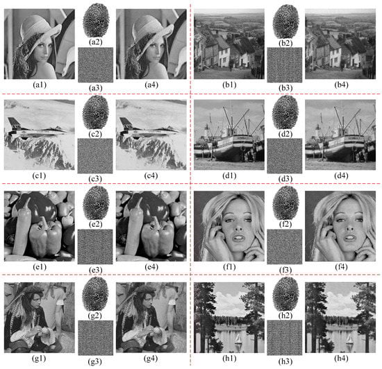 Figure 7 shows the stego-images and recovered images in this experiment when the compression ratio was 0.25 and the block size was 8. The relevant experimental data are provided in Table 1. In Figure 7, the fingerprint image with the size of 256 × 256 was treated as the image that was to be hidden by embedding it into the encrypted image, and then the stego-images were obtained as (a3), (b3), (c3), (d3), (e3), (f3), (g3), and (h3). Obviously, the image that is to be hidden and the stego-image are the same size. In cloud computing, this small size makes it easier to store and transmit the data, and this is especially important when storage and transmission resources are limited. When the receiver only has the encryption key, he/she can directly recover the original protected image from the stego-image. Moreover, the quality of the recovered image, which is evaluated by PSNR and SSIM in Table 1, is acceptable when the compression ratio is low. When the receiver only has the data-hiding key, he/she can extract the hidden data completely without seeing the content of the image as long as the stego-images are not distorted. Similarly, when the receiver has both the encryption key and the data-hiding key, he/she can extract the hidden data and recover the protected image.