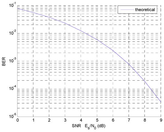 In the experiment in Section 4.1, we assumed that there was no distortion of the stego-image during transmission and storage, but that does not represent reality. Let us assume that the simulation experiments were performed in an ordinary communication environment with binary pulse amplitude modulation (BPAM) baseband signals and controllable additive white Gaussian noise (AWGN) []. The transmission characteristic of this system [] with the bit-error rate (BER) versus the signal-to-noise ratio (SNR) is shown in Figure 9, where is energy per bit and is the spectral density of the noise.