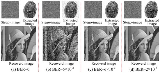 Figure 10 clearly shows that a poor transmission environment has more influence on the quality of the recovered images than it has on the quality of the extracted images. In Figure 10b, when BER was 6 × 10−2, the fingerprint pattern of the extracted image clearly was discernible despite the presence of noise around them. But the PSNR of the recovered image was only 12.26 dB, which is hardly acceptable to the human eye. However, when the BER was lower, both the extracted image and the recovered image had good visual qualities.