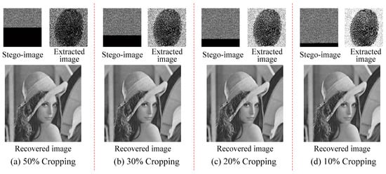 We also conducted a group of cropping tests, and the results are shown in Figure 11. To illustrate the cropping ratio more visually, cropped parts of the images are shown with black pixels. Obviously, when the stego-image was cut in half, i.e., the cropping ratio was 50% in Figure 11a, the visual effect of the extracted image was diminished by noise, but the fingerprint pattern was still discernible, and the quality of the recovered image was satisfactory. As the cropping ratio decreased, the quality of the extracted and recovered images increased.