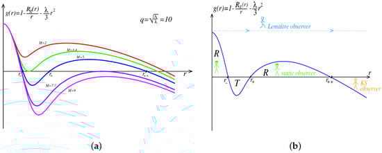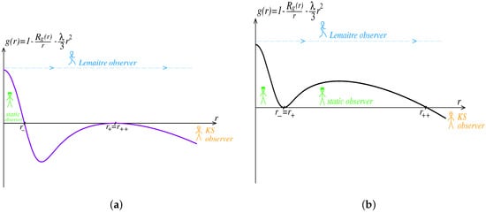 It follows that an extremum of in the region where , is a minimum. The transversal pressure becomes negative in the vicinity of the de Sitter center with the characteristic scale and in the asymptotically de Sitter region of large r with the scale . Then there exists only one region where . Since has different signs at and , the single minimum of implies the existence of at most 3 zero points of the metric function and hence 3 horizons of spacetime [100] and five possible configurations shown in Figure 1a [89]. Dependently on the mapping (choice of the observers reference frame) spacetime geometry presents the black (white) hole with three horizons, the internal horizon , the event black (white) hole horizon and the cosmological horizon , two extreme double-horizon states , , and two one-horizon states shown in Figure 1a [100]. Static observers exist in the R-regions and .