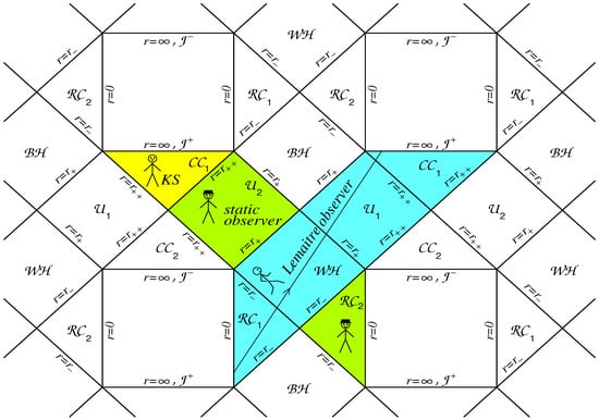 The Lemaître observers on the time-like radial geodesics, shown in Figure 1b and Figure 2, have to their disposal the whole manifold, . Transition to their (geodesic) coordinates , where R is the congruence parameter of the geodesic family and is the proper time along a geodesic, is given by the matrix relating the mapping to the mapping which reads [100]