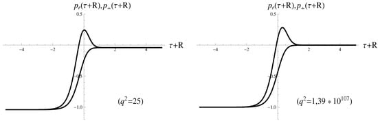 Cosmological evolution is governed by dynamics of pressures. In the spacetime with the de Sitter center the total density monotonically decreases to , hence the total radial pressure monotonically increases. Transversal pressure in the case of two vacuum scales evolves from the value at the inflation to the final value , through one maximum in between [100,105]. Typical behavior of pressures (normalized to ) dependently on q is shown in Figure 4; the variable is normalized to the GUT time s for GeV.
