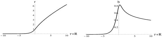 The inflationary stage is followed by a strongly anisotropic Kasner-type stage. As follows from the Lemaître metric in the form (6) corresponding to (7) with , for any function the expansion in the transversal direction with is accompanied by shrinking in the radial direction where until [100]. For () the metric at this stage () takes the form [100,105]