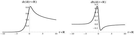 The behavior of two scale factors and of their derivatives at the early stage of evolution is shown in Figure 6 and Figure 7 [115]. The maximum in the scale factor at s corresponds to the maximum of the transversal pressure at cm in Figure 4.