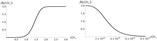 The equation of state, following from the conservation equation , reads [63,77] ; , where is the energy density, is the radial pressure, and is the transversal pressure for the anisotropic vacuum dark fluid [64]. The stress-energy tensors specified by (1) generate, as the source terms in the Einstein equations, the globally regular spacetimes with the de Sitter centre (replacing the Schwarzschild singularity) provided that the weak energy condition (WEC) is satisfied [78,79]. The spacetime symmetry breaks from the de Sitter group in the origin [78].