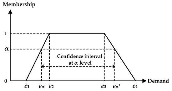 Considering the infeasibility of formulating stochastic demand that has been stated in Section 1, in this study, we employ fuzzy set theory to model demand uncertainty by using trapezoidal fuzzy numbers. Trapezoidal fuzzy numbers use four prominent points to describe the imprecise parameters, which can be seen in Figure 1 [45]. For a trapezoidal fuzzy number that measures a fuzzy demand [50], the definition of its prominent points are as follows.