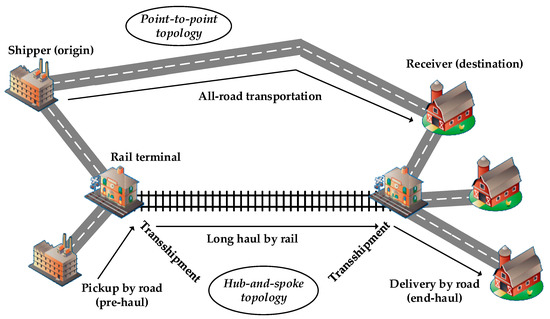 Road–rail multimodal transportation combines the scheduled rail transportation and unscheduled (time-flexible) road transportation to move containers from origins to destinations. The most typical transportation chain utilized in practice has three stages: pick-up (or pre-haul), long haul, and delivery (end-haul) [2,52]. By considering the advantages of road transportation for short- or medium-distance collection and distribution and of rail transportation for long-distance transportation, the pick-up and delivery are carried out by road and the long haul is by rail [4,10]. Consequently, the transportation network possesses a hub-and-spoke structure. A hub-and-spoke network is most suitable for a road–rail multimodal transportation system by integrating the respective advantages of rail and road transportation [53]. The hub-and-spoke network is thereby the backbone of the road–rail multimodal transportation system explored in this study. In such a network, the rail terminals play the role of the multimodal hubs where transshipments between rail and road transportation are conducted. The origins and destinations are the spokes.