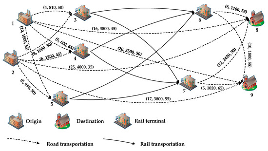 In this section, we present a numerical case to demonstrate the feasibility of the proposed method and further discuss the effect of demand uncertainty on the capacitated road–rail multimodal routing problem with time windows. The multimodal transportation network in the case is shown as Figure 5.