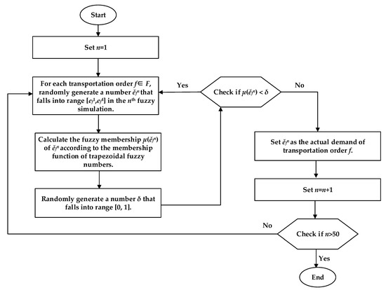 In most cases, are not enough data for decision makers to fit the probability distributions of demands [10,45,46], which reduces the feasibility of stochastic programming in dealing with the uncertainty. However, it is easier for decision makers to give their own estimations on the uncertain parameter. The estimation might be pessimistic, optimistic, and moderately optimistic [47]. Therefore, it is worthwhile to use fuzzy logic to address the uncertainty according to the expert experiences and opinions. There are three forms of fuzzy numbers that are most commonly used in the fuzzy programming model, i.e., interval numbers, triangular fuzzy numbers and trapezoidal fuzzy numbers [48]. Compared with triangular fuzzy numbers that have already been used in modeling the road–rail multimodal routing problem with demand uncertainty [36,37,39], trapezoidal fuzzy numbers is more flexible since it allows that different decision makers hold different opinions on the most likely values of the demand and hence better match the practical decision-making situation [18]. Consequently, in this study, we select trapezoidal fuzzy numbers to model the uncertain demand.