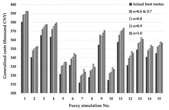 After defuzziness in Section 5.1 and Section 5.2 and linearization in Section 5.3, we can get a MILP model for the capacitated road–rail multimodal routing problem with fuzzy demands and soft due date time windows. The optimization objective of the model is Equation (23) and its constraints include Equations (6), (7), (10), (14)–(16), (21), (22), and (24)–(33).