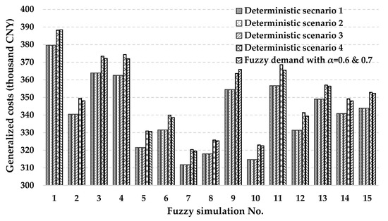 Fuzzy expected value model is widely used to deal with the objective functions with fuzzy parameters [10,63,64]. It aims at minimizing the expected value of the objective functions (Equation (17)).