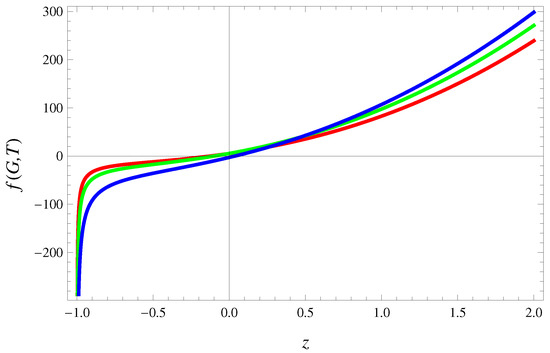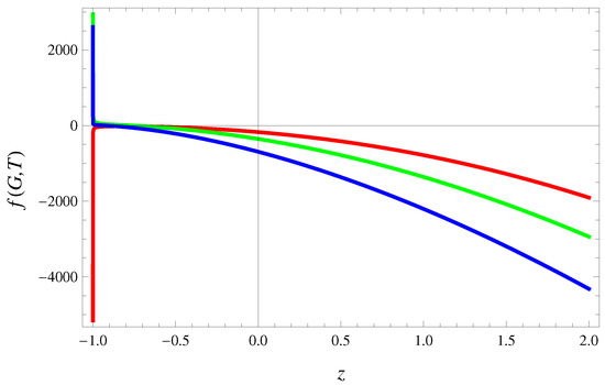 The plot of this model against z is shown in Figure 2. We have taken free parameters as , , , , and for three specific values of giving red, green and blue curves throughout the analysis for non-conserved EMT regime. This model demonstrates gradual decline as z elapses. Also, as which specifies the realistic phenomenon of the desired model.