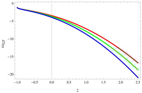 Plot of parameter against z for (red), (green) and (blue) shows phantom expansion for entire cosmic evolutionary regime in case of non-conserved EMT.