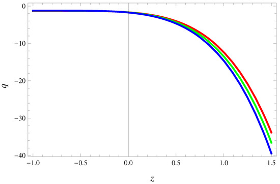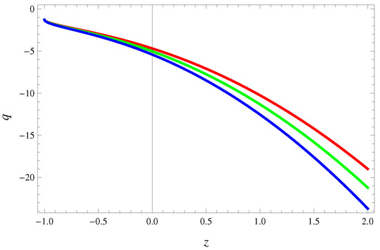 Plot of deceleration parameter against z for (red), (green) and (blue) indicates accelerating cosmic era for non-conserved matter distributions.