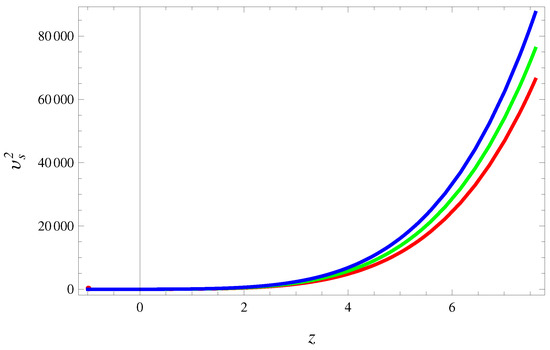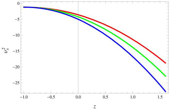 Squared speed of sound parameter against z for (red), (green) and (blue) shows stability of the model for current cosmic evolution while becomes unphysical for late-time cosmic regime in case of non-conserved EMT.