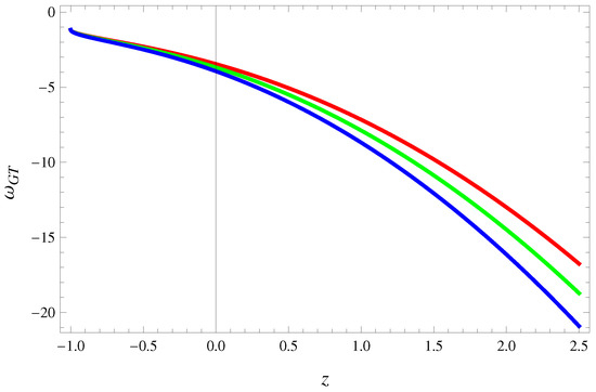 Plot of EoS parameter against z for (red), (green) and (blue) for conserved EMT shows phantom regime of the universe.