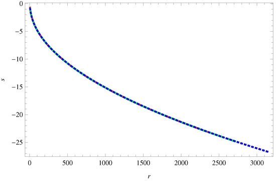 Plot of against z for conserved EMT for (red), (green) and (blue) illustrates instability of the model.