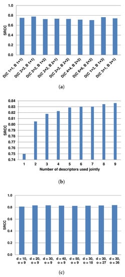 Figure 6a contains SRCC values obtained for the SEER with only one HOG descriptor, using the protocol introduced in the previous section, on the TID2013 dataset. TID2013 was used due to its size and the number of image distortions. In the experiment, the performance of the SEER with many different HOG parameters was investigated. The presented HOG descriptors were run with