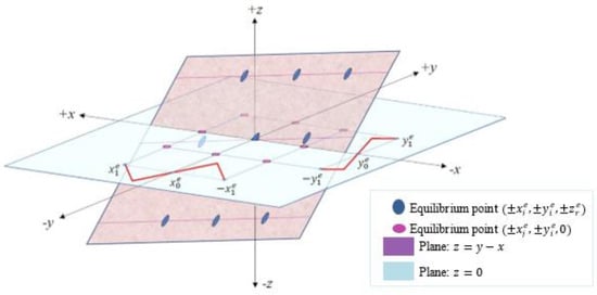 - Equilibrium points: As mentioned earlier, the distribution of saddle index-2 equilibrium points over the -plane to get a grid of scroll chaotic attractor. By setting , the equilibrium points can be discussed as follows: