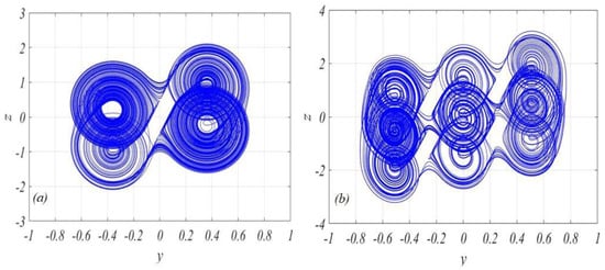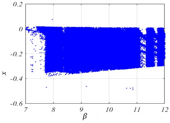 - Bifurcation diagram: To confirm the existence of chaos in the new system (3) with (4), assume that the case of . Then, . The bifurcation diagram of the parameter of system (3) with (4) can be obtained as illustrated in Figure 4.