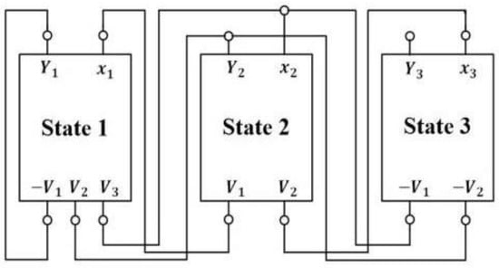 The design scheme of CNN cells connection is proposed for realizing model (14) as shown in Figure 6. Assuming that and and for the first cell, and for the second cell, and for the third cell.