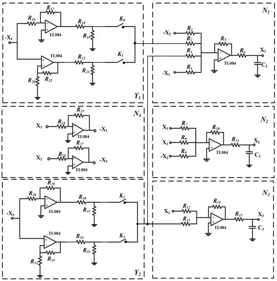 The CNN circuit scheme of system (13). The components are chosen as follows: , , , , , , , , , , , k, k, k, .