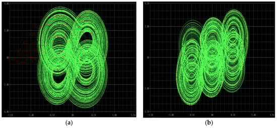 PSpice results. Phase portraits of grid scroll attractors of CNN circuit as: (a) ; (b) on -projection, V/div, V/div.