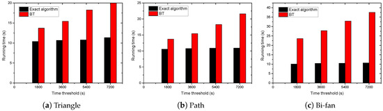 Finally, the performance of the exact algorithm is significantly better than the performance of the BT algorithm. From theoretical complexity analysis above and the analysis in [31], we can see that the computational complexity of the exact algorithm is , and that of the BT algorithm is , where , and are the edge numbers of , H and G, respectively. It is easy to see that the computational complexity of the exact algorithm is lower than that of the BT algorithm. Although our algorithm is slightly slower than the BT algorithm in some cases, such as Figure 2b and Figure 4a, the overall running time of our algorithm is better. Especially when is very large, the exact algorithm can even have a 3× acceleration compared to the BT algorithm.