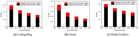 First, the running time of the two algorithms increases with the increase of the time threshold . To better explain the performance of the exact algorithm in Figure 2, Figure 3 and Figure 4, Figure 5 gives the number of subgraphs in set S under different time thresholds. It can be seen that the number of subgraphs in set S decreases with the increase of . Therefore, the edge number of subgraph increases with the increase of . In Figure 5, we can also see that most of subgraphs in S have fewer than three edges, and the number of larger subgraphs decreases slightly with the increase of . Obviously, most of the reduced graph in S are the graphs with few edges and require very little calculation, which means that the decrease of the graph number in S has little impact on the performance of the algorithm. Thus, when the time threshold increases, the running time of the exact algorithm is mainly affected by the edge number of subgraph in S and increases inevitably. Similarly, with the increase of , the number of intermediate results processed by the BT algorithm increases, which results in the increase of the running time. Besides, it can also be seen in these figures that the change of running time caused by in BT algorithm is more obvious than that in the exact algorithm.