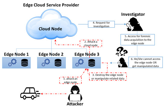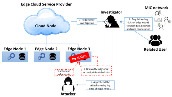 The edge cloud, which brings services close to customers, is less manageable and secure than conventional cloud-computing environments because edge nodes are closer to users than edge-cloud managers. For example, malicious users or attackers might attack edge nodes, man-in-the-middle (MITM) attacks enable information modulation and deletion, and Rogue Gateway and Rogue Data Center attacks are disguised as normal edges between data center and users [2,3,4]. In fact, in 2017, attackers hacked into a thermometer installed in the aquarium of a casino hotel and then infiltrated the casino network. In May 2018, a company website was suspended for four days after an Internet of Things (IoT) device containing routers, security cameras, and digital video recorders was attacked. The number of hacking attempts through these service end-points is increasing, and the collection of forensic data for the enhanced security of end-points and the investigation of security incidents has become important.