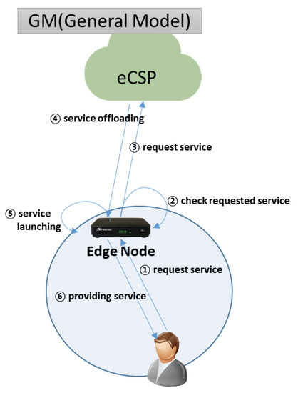 As shown in Figure 2, the general model (GM) is a conventional edge-cloud service model. If a user requests a cloud service on the nearest edge node, and the service is not launched in the edge node, the edge node requests the user’s service from the eCSP, and then downloads and launches the service to provide the service to the user. If the requested service is already launched, it quickly provides the service to the user without requesting it from the eCSP. In such cases, log information is recorded only on edge nodes.
