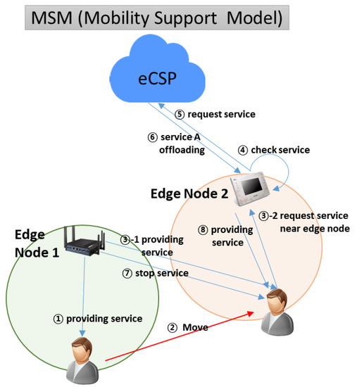As shown in Figure 3, the MSM is a service model that provides seamless cloud services to mobile users or devices. When a user or device is moved from Edge Node 1 to Edge Node 2 to efficiently realize a service, the edge node that is providing the service is replaced by a close edge node to ensure quality of service (QoS). In this case, logs are written to multiple edge nodes depending on the path of the user and device.