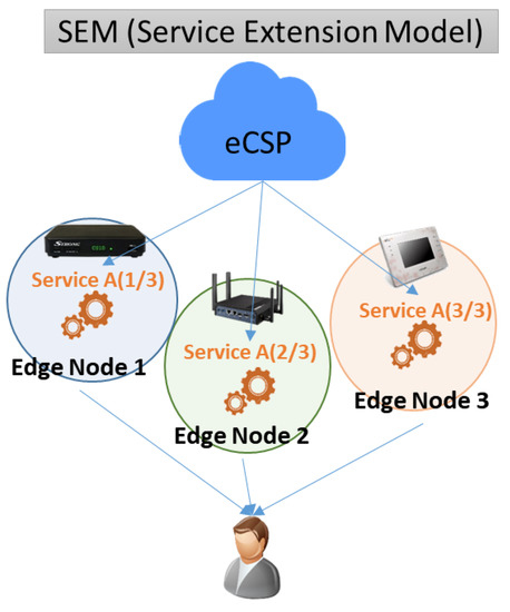 As shown in Figure 4, the service-extension model (SEM) is a service model that simultaneously processes across multiple edge nodes when the network environment is proper and computing resources of the requested service are higher than one edge node. For example, when a user uses a virtual-reality (VR) service on a 5G network, the eCSP can divide it into three VR screens and provide images from each of the three edge nodes because network speed is sufficient but exceeds edge-node performance. In this model, a service log is generated in every edge node.