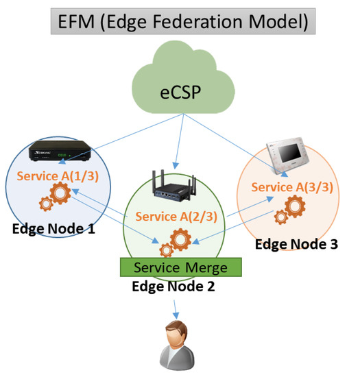 As shown in Figure 5, the edge-federation model (EFM) is a service model that provides services by dividing tasks into different edge nodes and integrating the result into the main edge node (Edge Node 2) because the computing resources of a single edge node are lower than the computing resources of the requested service. This model handles task distributions, such as SEM, but does not directly connect all edge nodes to the user (or device). Only Edge 2 directly provides the requested service to the user, but Edge Nodes 1 and 3 are only connected with Edge 2. In this case, because log information for Edge Nodes 1, 2, and 3 is different, additional information is required to identify logs of the same service for Edge Nodes 1, 2, and 3.