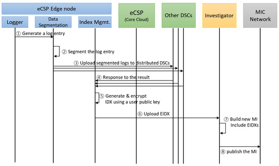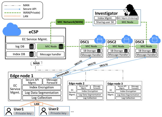 Investigators: Investigators have the right to investigate security accidents and collect log data regarding services and users from eCSPs if there is a search-and-seizure warrant related to a security incident. An investigator manages the MIC network, collects an encrypted index file from distributed edge nodes, publishes an MI that groups several encrypted index files on the MIC network, and then shares the MI with all network participants to ensure the integrity of encrypted index files. In addition, if log collection is required for a security-incident investigation, the investigator can collect distributed stored segmented logs, receive the user’s private key, and recover those segmented log files. Investigators share the MIC that includes information of many indices with MIC network participants over a wide area network (WAN).