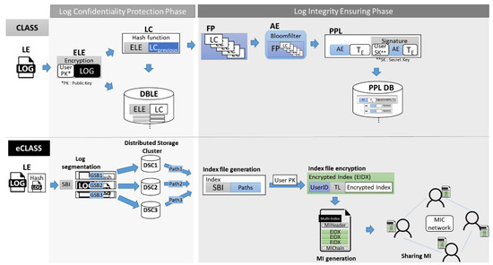 Confidentiality and privacy: To protect log confidentiality and user privacy, eCLASS prevents information disclosure by dividing logs into sizes that make it difficult to extract information, and by non-continuously arranging logs. It also performs distributed and overlaid storage for different storage providers, preserving log confidentiality and safety. Finally, the index is encrypted using the user’s public key to protect privacy.