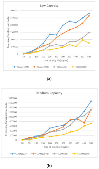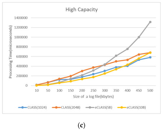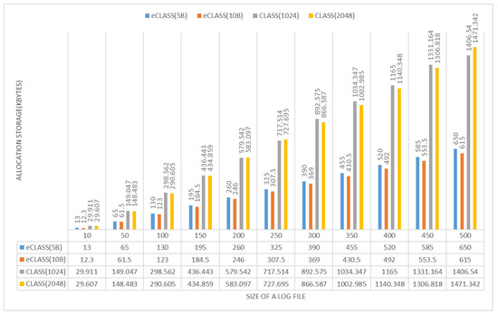 Storage allocation rate: Data size actually increases with data encryption. As shown in Figure 15, CLASS log encryption results in approximately three times larger files and requires more storage. As a result, CLASS needs storage capacity for as long as data increase. In eCLASS, the size of the log data does not increase because eCLASS uses the log-segmentation and partition methods. When segmentation information is included, log data are increased by about 1.3 times.