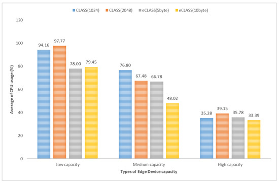 The CPU allocation rate: The study compared the total CPU used for the data-collection phase from 10–500 KB log sizes. As shown in Figure 14, CLASS encryption and eCLASS data segmentation had similar performance in high capacity. However, at low capacity, eCLASS was more efficient: 5 byte segmentation used 19.77% less CPU than CLASS (RSA 2048). In addition, at medium capacity, 10 byte segmentation used 28.78% less CPU than CLASS (RSA 1024), providing a more reliable and cost-effective logging service.