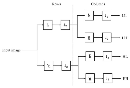 Image decomposition using analysis filter banks. Note that is low-pass filter and is high-pass filer and ↓2 is keeping one sample out of two (down sampling).