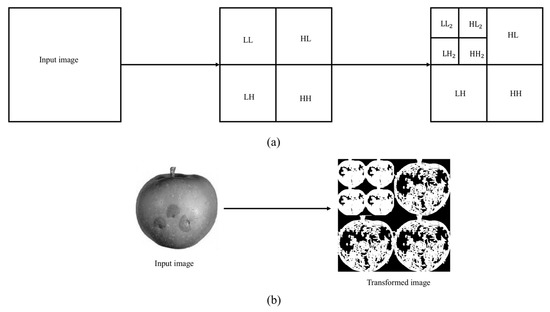 2D-DWT wavelet decomposition at two resolution levels (a) the structure diagram, (b) apple image via wavelet decomposition at two resolution levels.