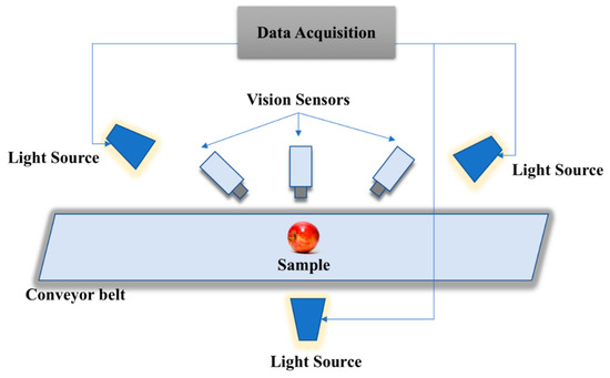 Instead of analyzing the performance only against defective and non-defective, we also evaluated the method on low-quality region as well. Due to the shortage of defective and non-defective images datasets that comprises low-quality region, two newly apple image datasets are created, namely NDDA and NDDAW datasets. The NDDA generally consist of various types of apple images, while the NDDAW consist of more apple images with low-quality region on its skin. Each of the dataset are classified into two categories of non-defective and defective. The non-defective and defective classification are verified by the agriculture practitioners from Malaysian Agricultural Research and Development Institute (MARDI) and Pahang Agriculture Department. The datasets are collected using vision sensors and some of the apple images were collected via the Google search engine with several keywords such as “fresh + apple”, “healthy + apple”, “apple + disease”, “damage + apple”, “defect + apple” and “low + grade + apple + fruit”. This is due to the difficulties in obtaining various types of defective apple. Most of the apple images obtained from Google search engine are center, clean and occupied most of the image without or very few cluttered environments. This is similar to the data acquisition via vision sensor in the research that captures apple images placed on the conveyor belt as illustrated in Figure 5. To ensure the quality of the images, the light sources are placed near to the vision sensor and are uniformly distributed. This is done to reduce the effect of shadows and glare. The image resolution of all the images captured using vision sensor are 900 × 700 pixel. While the resolution of the images obtained via Google search engine may vary from 205 × 220 pixel to 552 × 512 pixel. Each of the images obtained from Google search engine in both datasets are rescaled to 900 × 700 pixel following the resolution setting of the images captured via vision sensor. Datasets are available online at https://github.com/AsIsmail/Apple-Dataset. The details of each dataset are described in the following subsections.
