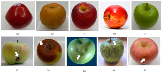 Examples of apple images in the NDDA dataset. The first row is the examples of non-defective apples and the second row is the example of defective apples: (a) Red Delicious, (b) Gala, (c) Fuji, (d) Honeycrisp, (e) Granny Smith, (f) Scab, (g) Rot, (h) Cork Spot, (i) Blotch, (j) Bruise.